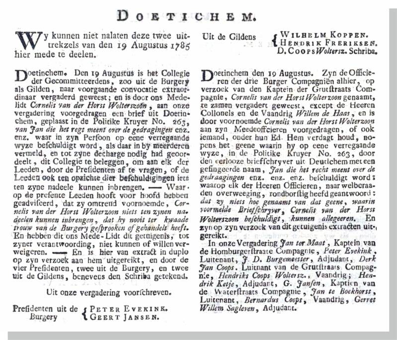 DOETINCHEM den 3 January 1785. Voor eenige dagen heeft onze burgery zig wederom, tot herstel van verwaarloosde en verzuimde voorrechten, en redres van drukkende bezwaren, aan ieder Magistraat dezer Stad geadresseerd. Men houdr zig verzekert, aan ieder weldenkend Nederlander zal verbaast staan over den aanmerkelyken inhoud van dit Adres, en tevens bewonderen de bedaardheid, gematigheid, doch te gelijk de cordaatheid en mannelyke vrymoedigheid, met welke onze agtingswaerdige Burgery op eene volmaakte eensgezinde wyze aanhoudt by hare Regeerders, om eens in het volle bezit, van haren wettigen eigendom, het genot harer Burgelyke Vryheid en onafhanglykheid, hersteld te worden. Buiten bedenking blijft de aandagt van een ieder op het besluit, dat de Magistraat nemen zal, gevestigt.